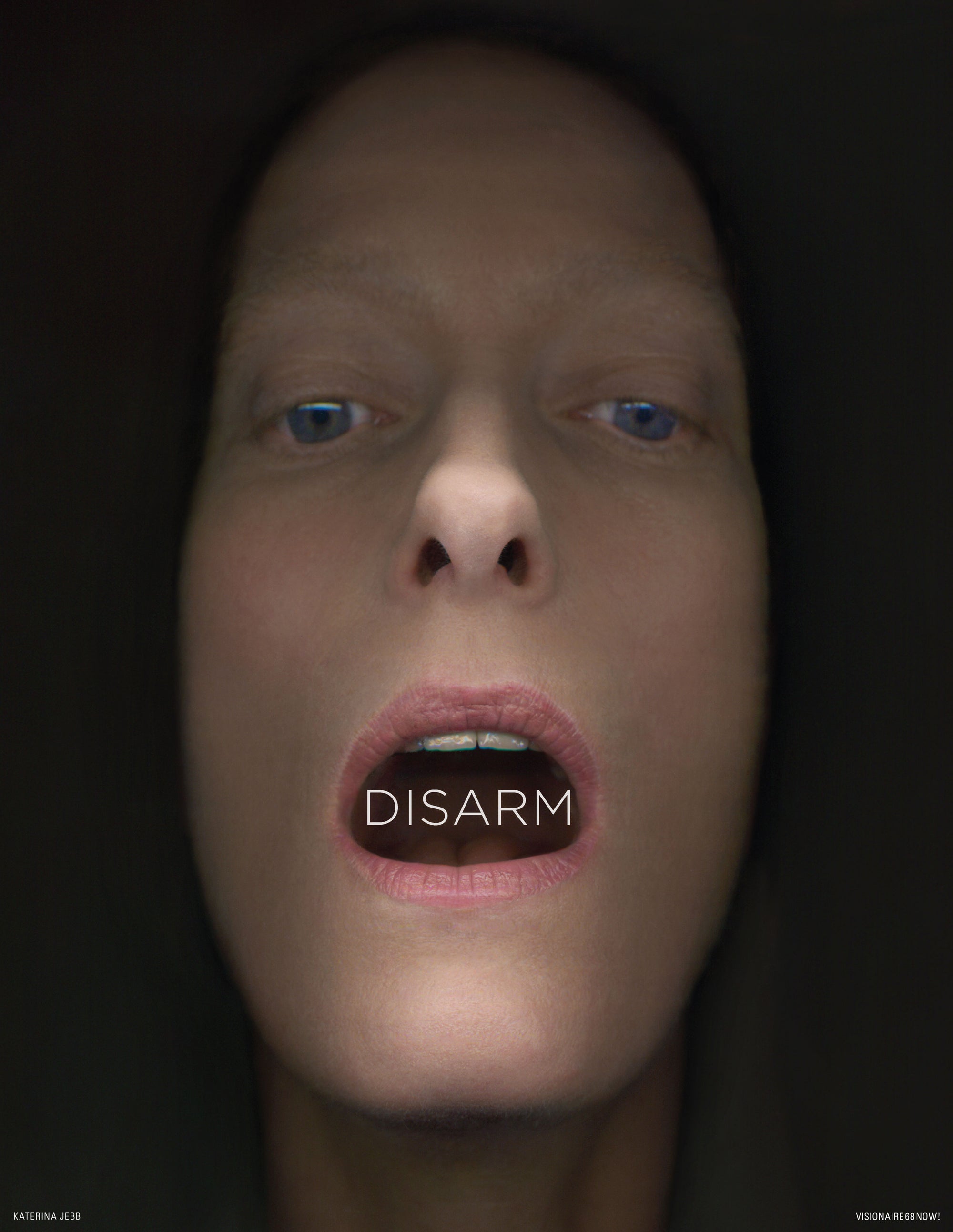 Katerina Jebb proposes a scan portrait of Tilda Swinton made in 2008 . Jebb inserts the word “DISARM” into the open mouth of Swinton. The life-size image explicitly confronts GUN CONTROL in America today.