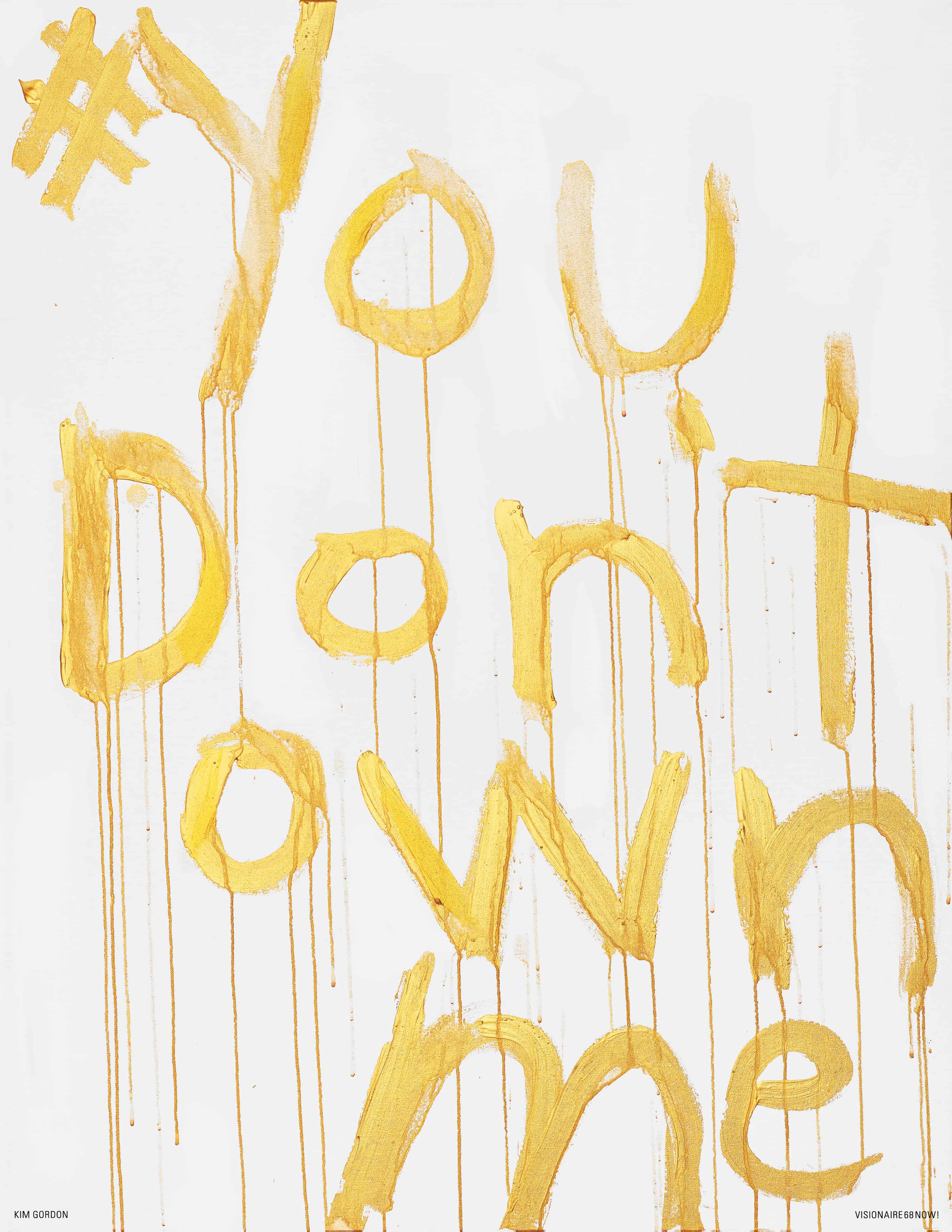 KIM GORDON is widely recognized for her cultural contributions as founding band member of Sonic Youth, as well as her paintings which often explore the power of text. Her protest poster comes from a series of protest paintings, in gold, a reference to sitting president Donald Trump, and the idea of protest art as it becomes a decorative object. The line, You Don’t Own Me, refers to WOMEN’S RIGHTS and the mounting protest against the wave to reverse Roe vs Wade, but it is also about art collecting.