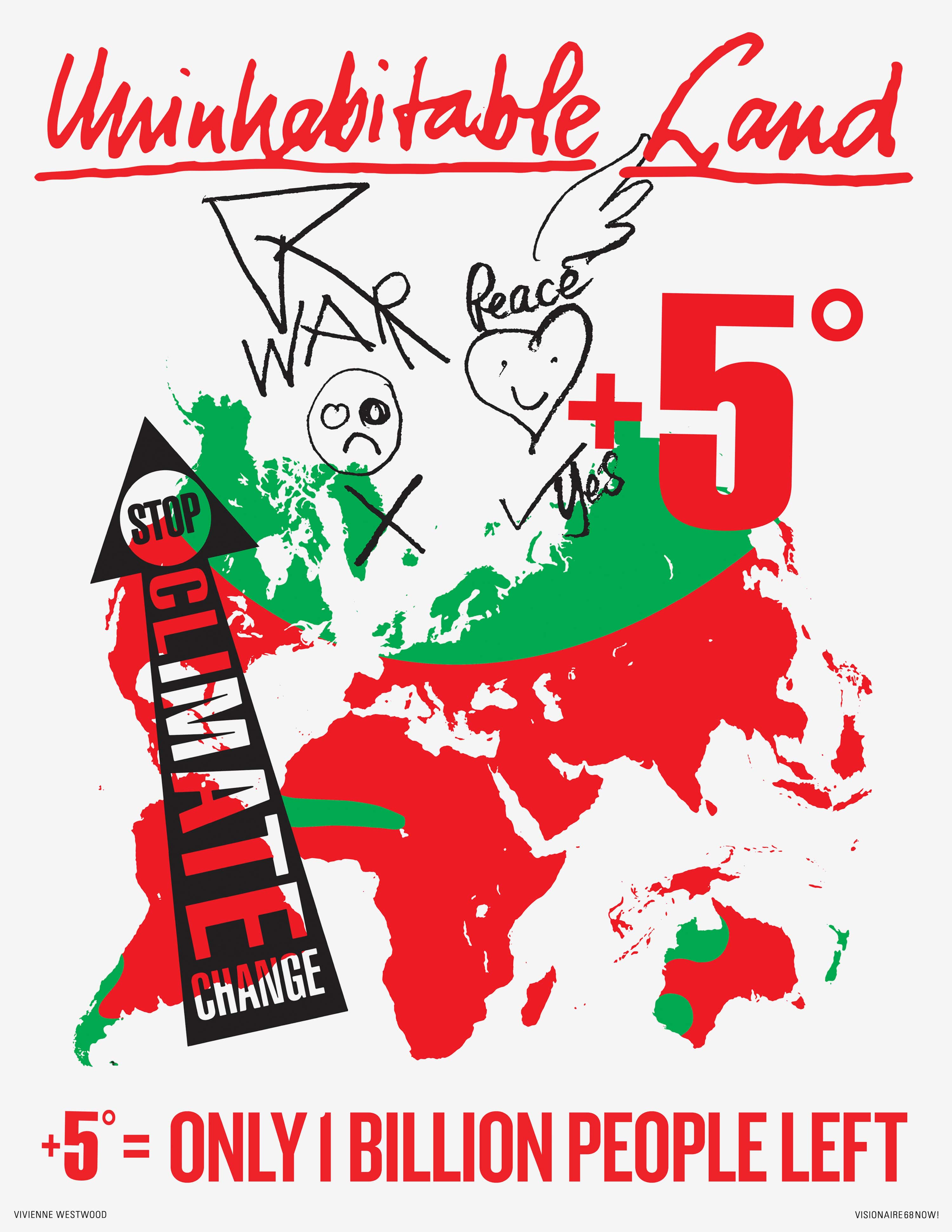 Fashion designer VIVIENNE WESTWOOD has become a vocal proponent of green energy and its necessity in this day of CLIMATE CHANGE. Westwood uses her fashion and her notoriety to bring awareness to this urgent cause. “People ask, ‘what can I do to help save the environment?’ In all my time as an activist, I’ve never had a satisfactory answer. Now we know: switch to a green energy supplier. This map is the world at 5 degrees. If you draw a line parallel with Paris, everything below that is uninhabitable. This means by the end of this century there will only be one billion people left. Global warming is at the tipping point. If we go past it, we can’t stop it. All the methane kicks in. We’re there right now. We have to stop it!” @ClimateRevolution